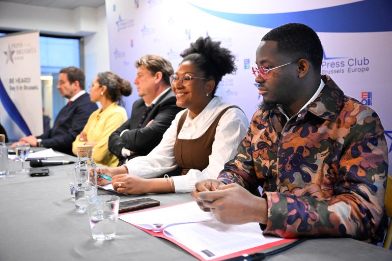 (From R) Murdered Congolese independence icon Patrice Lumumba’s relatives Yema Lumumba and Mehdi Lumumba, German lawyer of ECCHR NGO Wolfgang Kaleck, and Belgian lawyers Jehosheba Bennett and Christophe Marchand hold a press conference following a hearing before a Belgian court to weigh prosecuting the sole surviving suspect over the 1961 killing, in Brussels on January 19, 2026 [AFP]