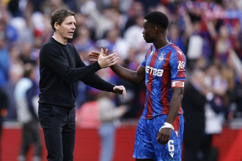 Crystal Palace’s manager Oliver Glasner, left, and defender Marc Guehi both appear to be heading to the exit door at the Premier League club [Tolga Akmen/EPA]